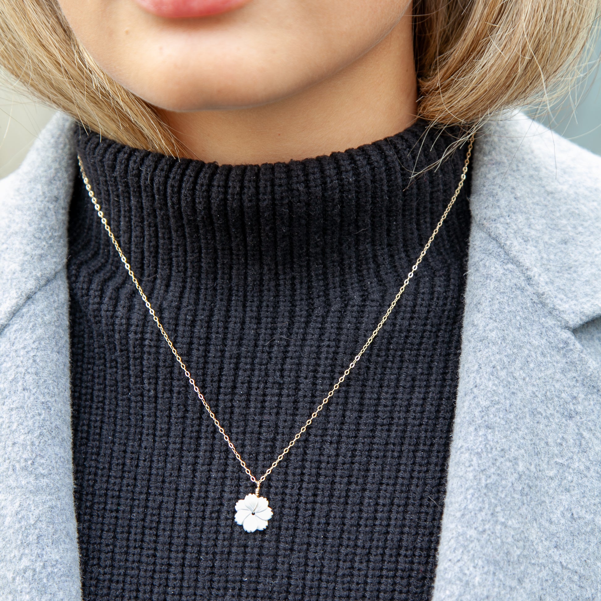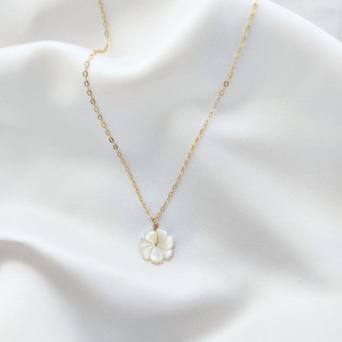 Ručně vyřezávaný květ z perleti zavěšený na jemném řetízku. Něžný a romantický šperk.