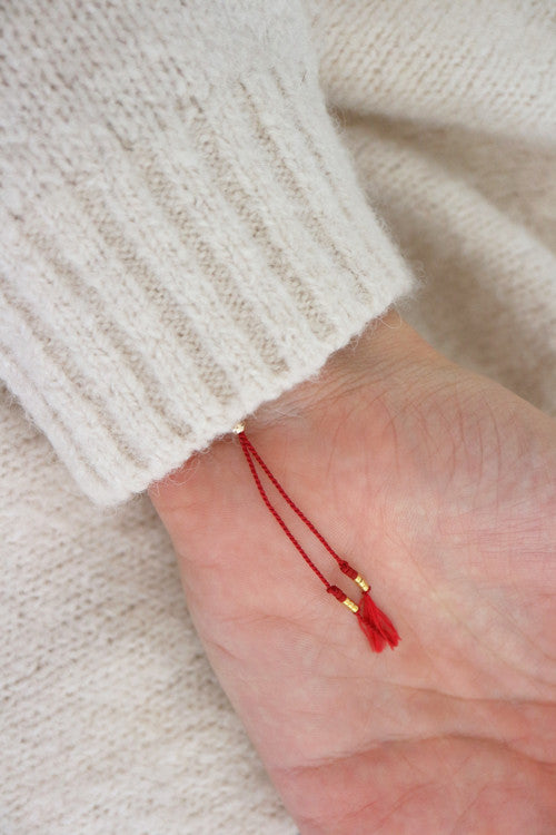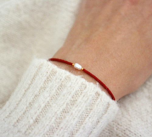 Náramek z malinkých červených korálků, dvou pozlacených 24 karátovým zlatem a malé sladkovodní perly na hedvábné šňůrce.