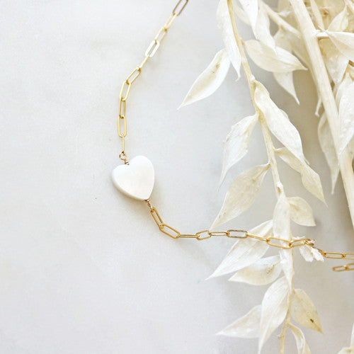 Náramek z řetízku tvořeného propojenými oválky s perleťovým srdíčkem. Náramek je potažen několika vrstvičkami 14 kt zlata (gold filled), díky tomu jej bez obav můžete nosit každý den.