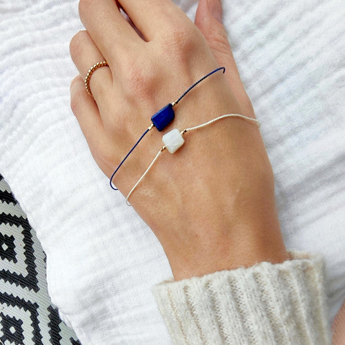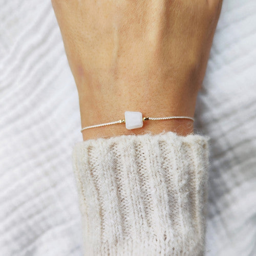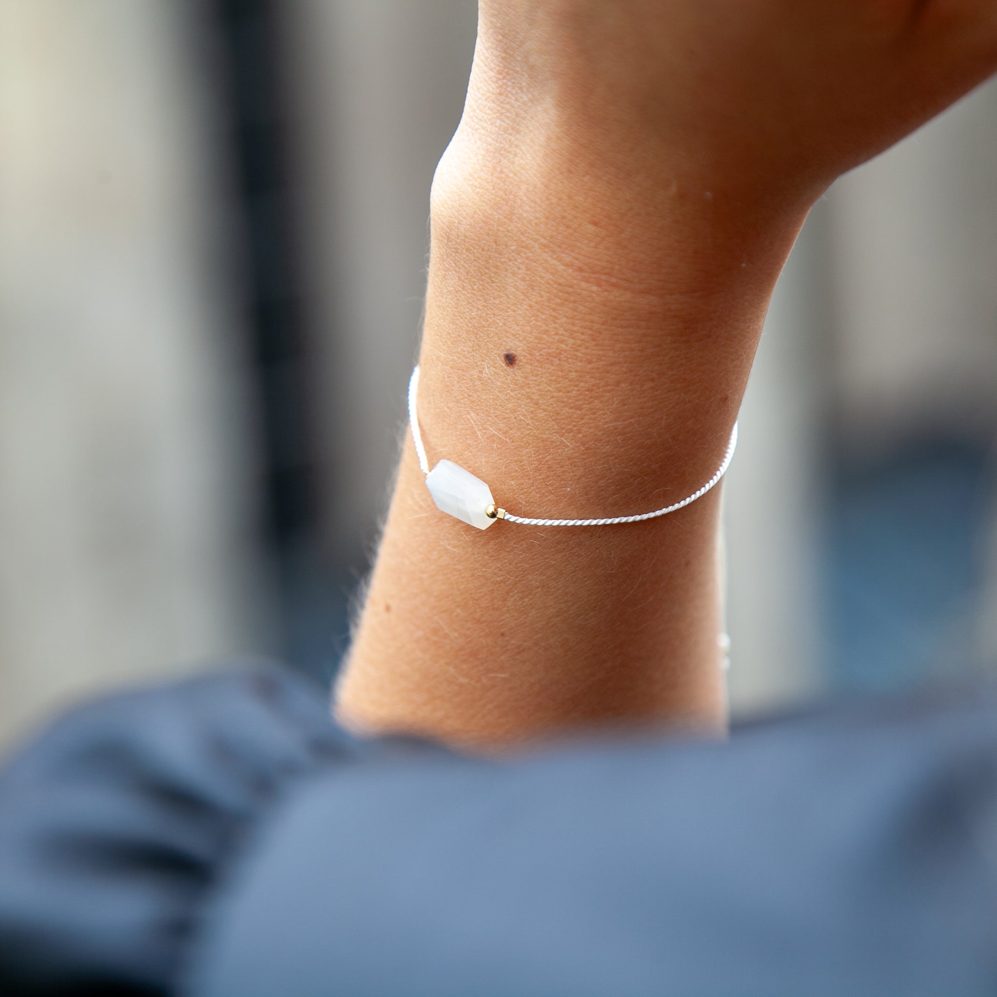 Minimalistický náramek z bílé hedvábné šňůrky s měsíčním kamenem a zlatých korálků.