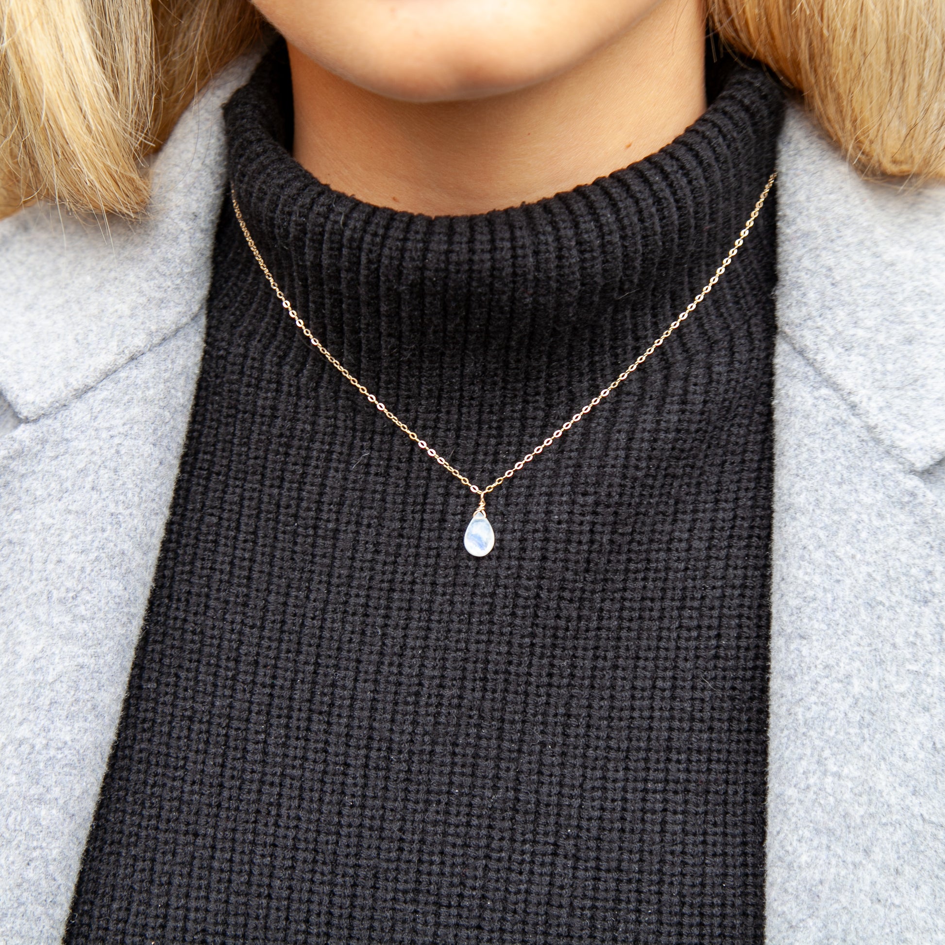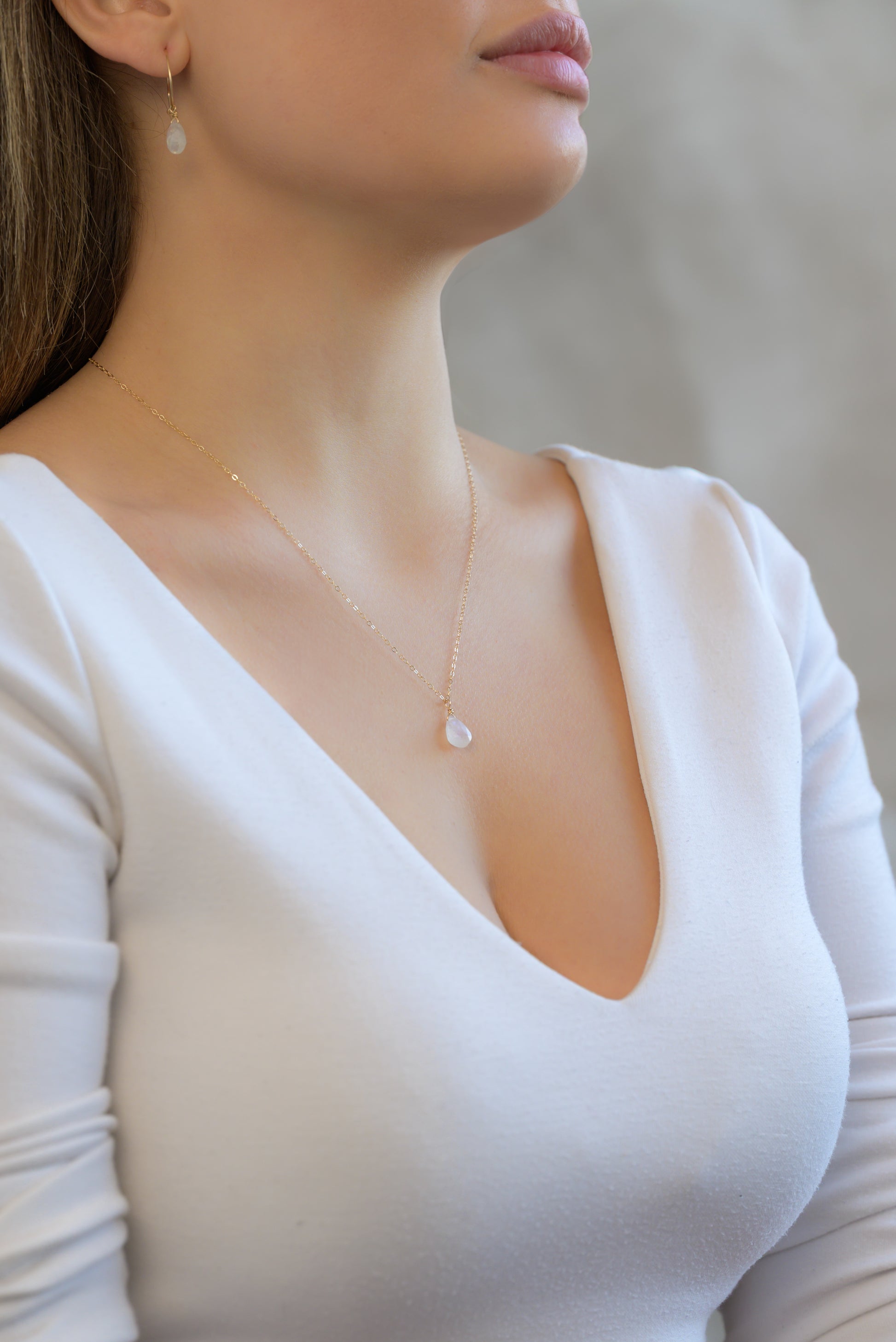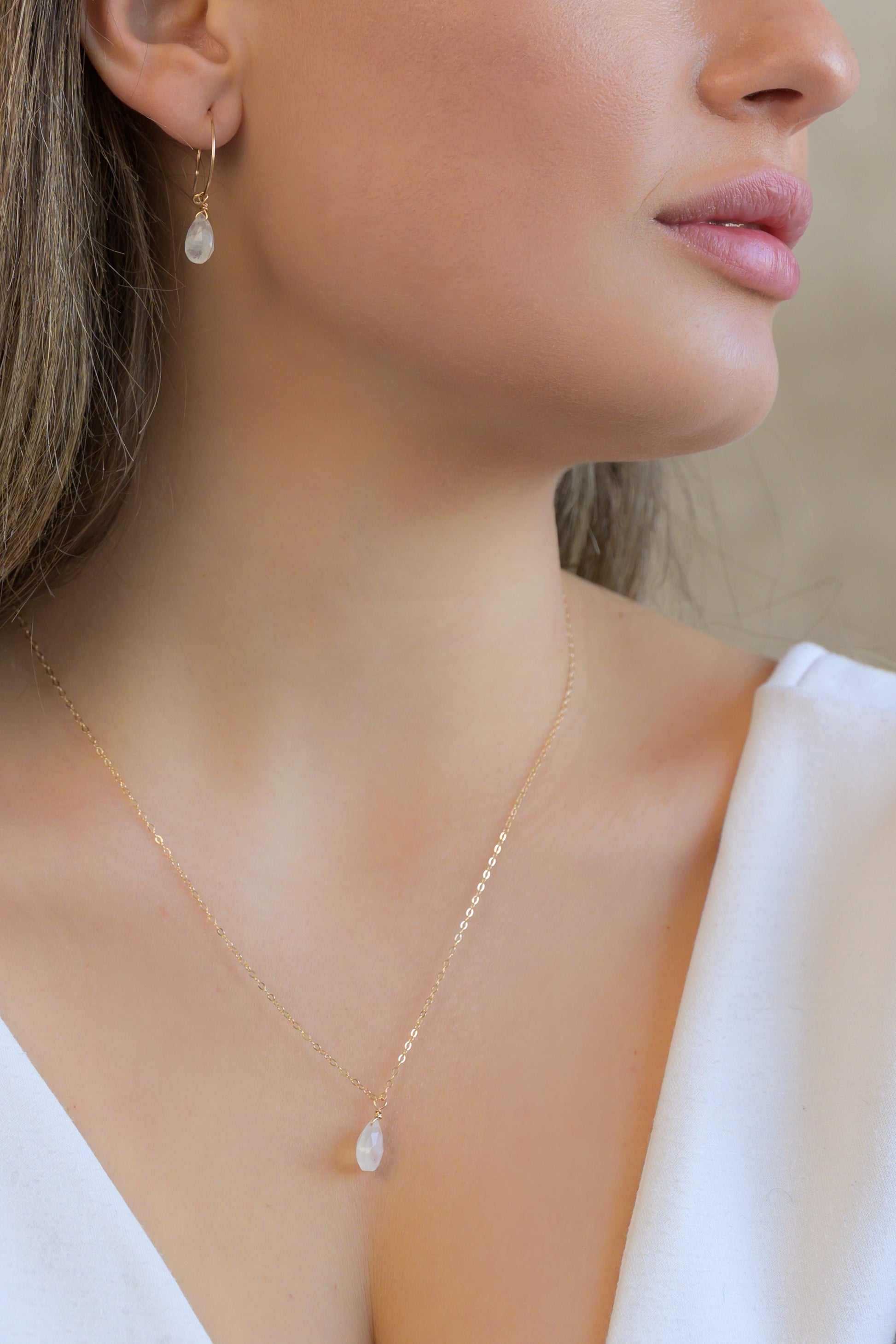 Náhrdelník a kruhové náušnice s nádhernými kapkami broušených měsíčních kamenů. Jde o tzv. "blue fire" měsíční kameny s jemnými tyrkysovými odlesky.