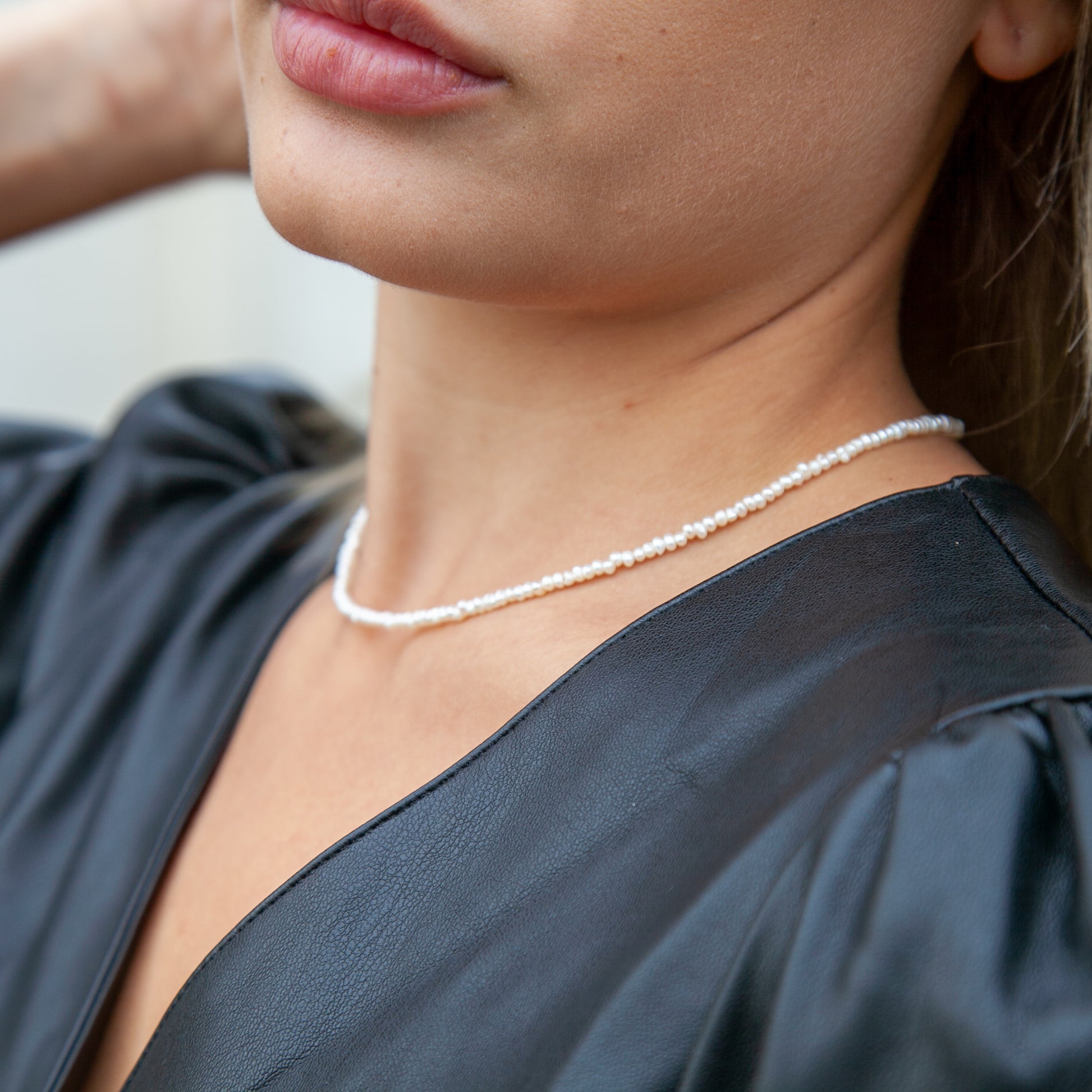 Krátký náhrdelník (choker) vytvořený z malinkých zploštělých sladkovodních perliček. Něžný doplněk a top šperk současnosti.