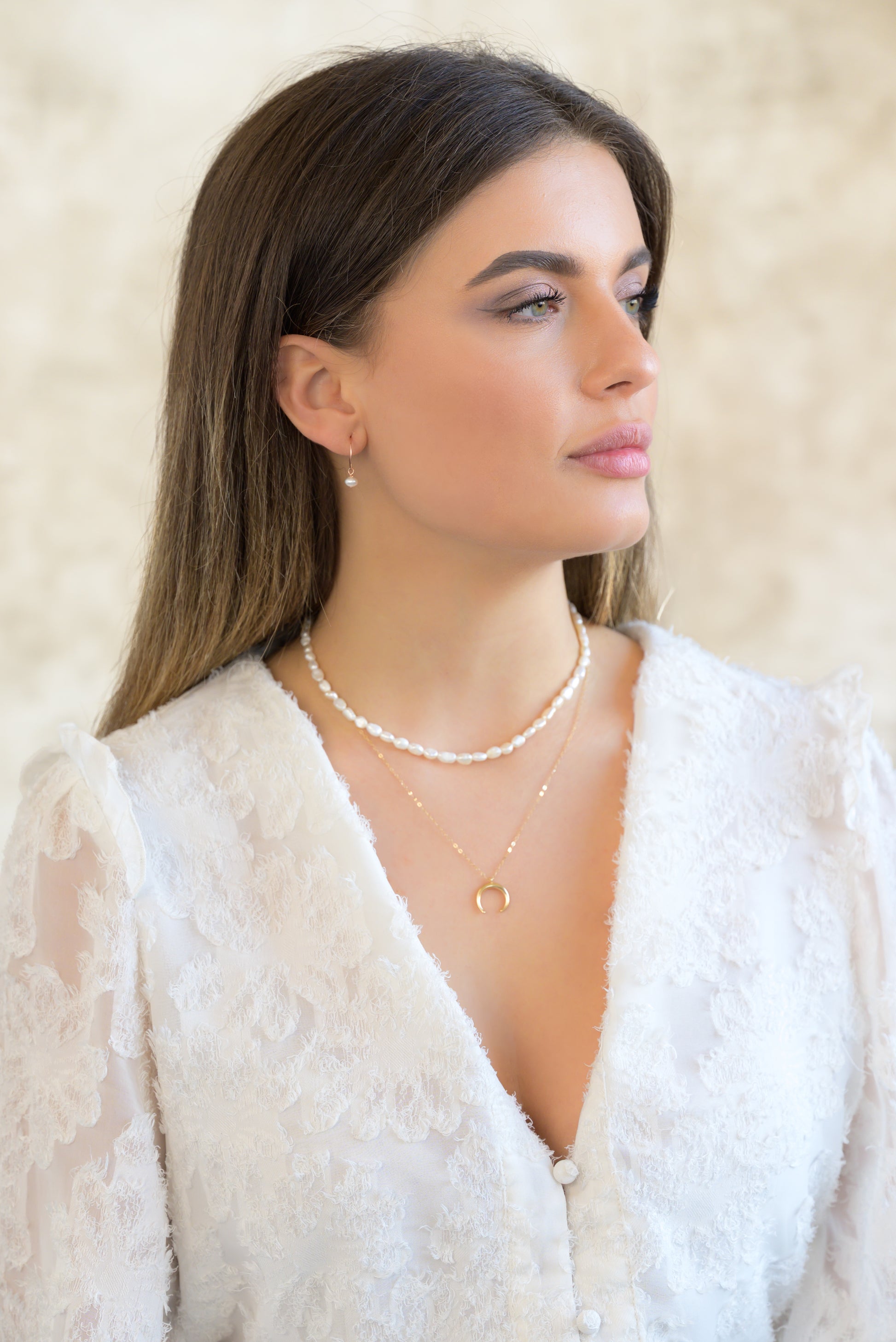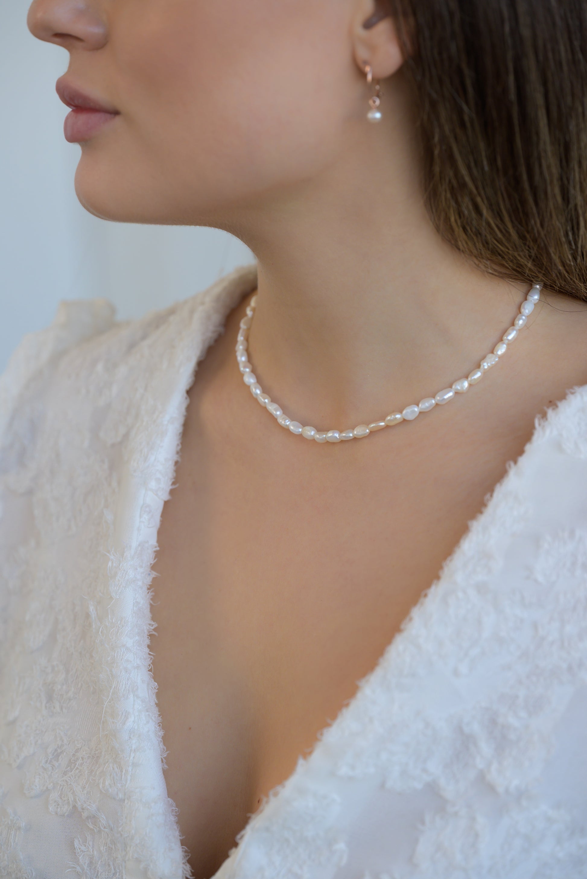 Krátký náhrdelník (choker) z oválných, mírně nepravidelných sladkovodních perel. Něžný doplněk, který vypadá krásně samostatně, i v kombinaci s dalšími náhrdelníky.