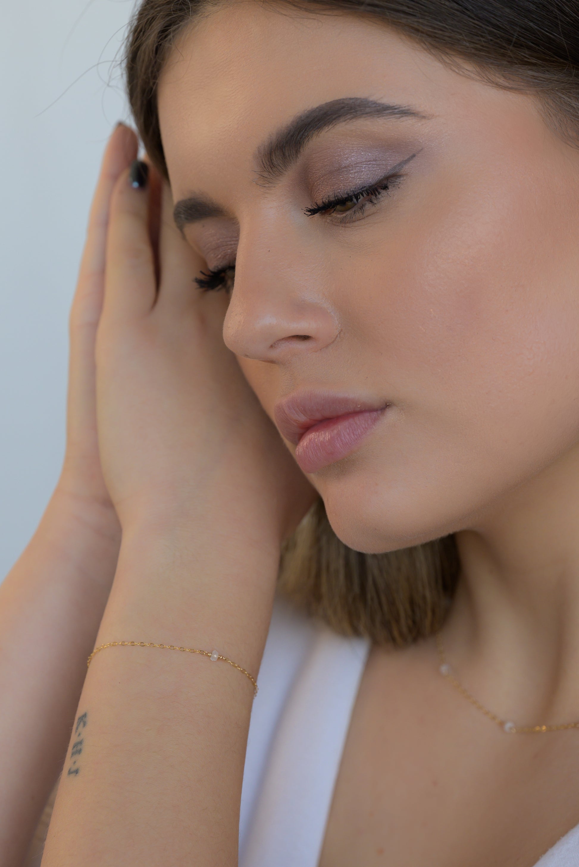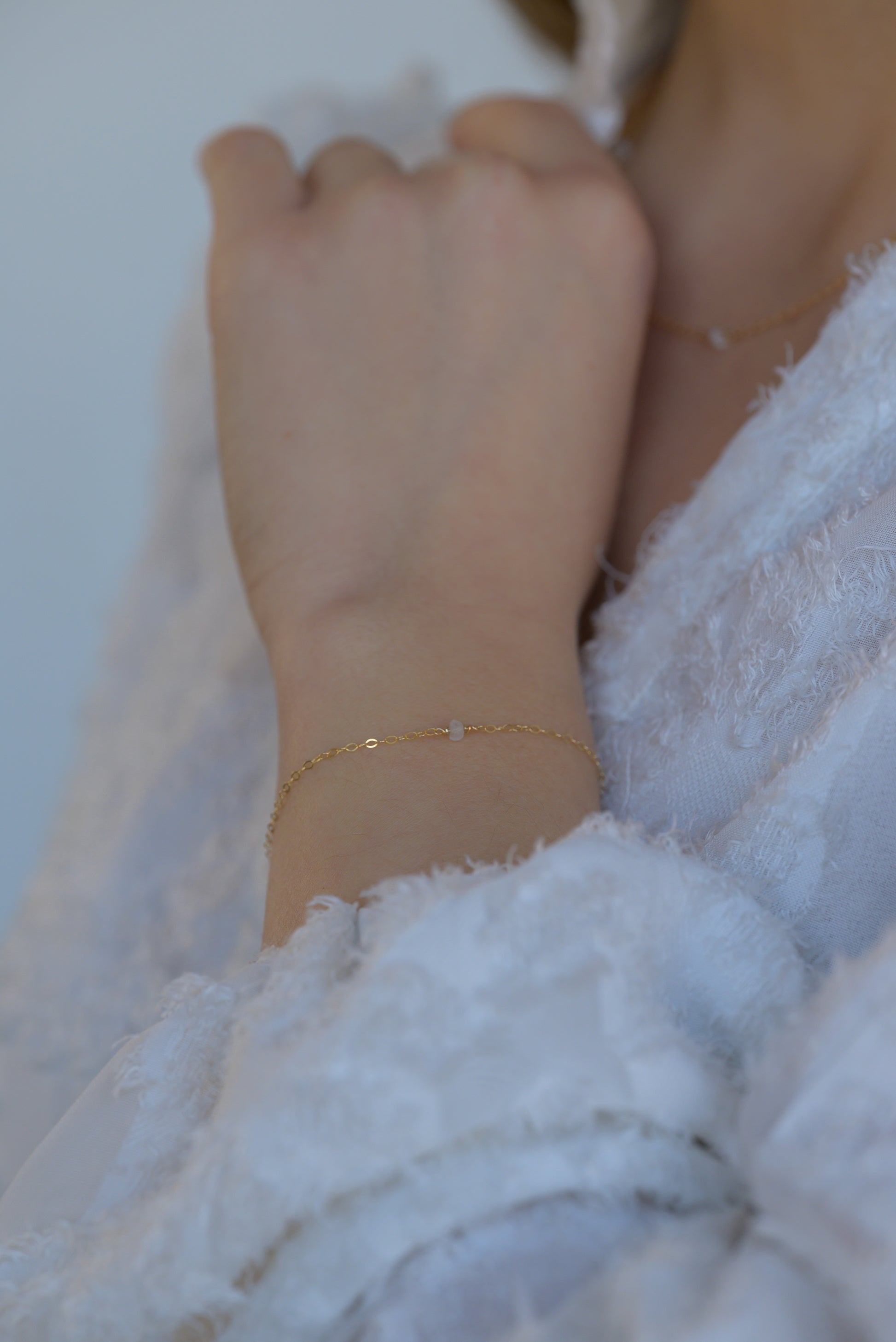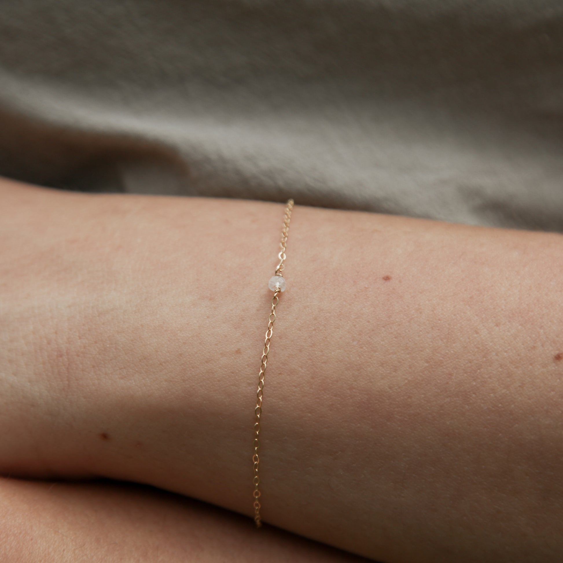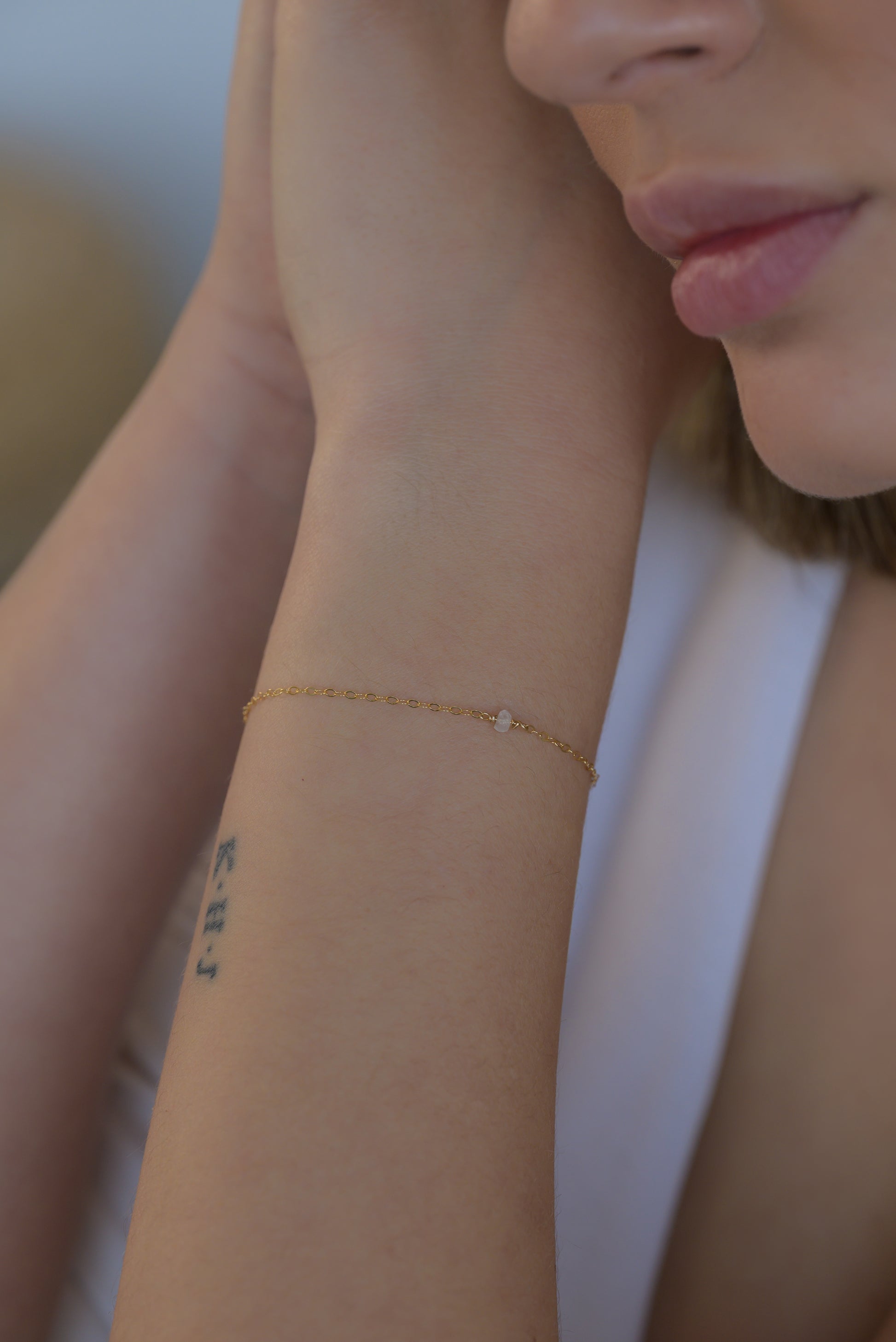 Něžný, minimalistický náramek s drobným broušeným měsíčním kamenem. Náramek je tak lehounký, že jej na ruce téměř necítíte, proto jde o ideální šperk na každodenní nošení. Bez obav jej můžete brát i do vody.