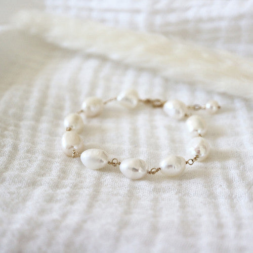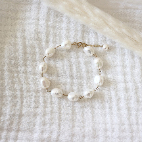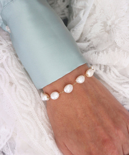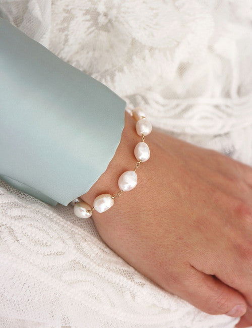 Náramek z větších sladkovodních "barokních" perel oválného, mírně nepravidelného tvaru. Konec řetízku je ozdoben malou perlou.
