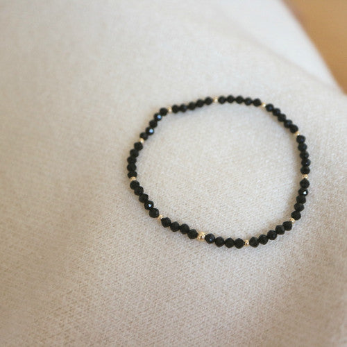Náramek z těch nejmenších černých spinelů. Doplněny jsou zlatými 14 kt gold filled korálky. Spinely jsou broušené, díky tomu krásně odrážejí světlo a jemně se třpytí.