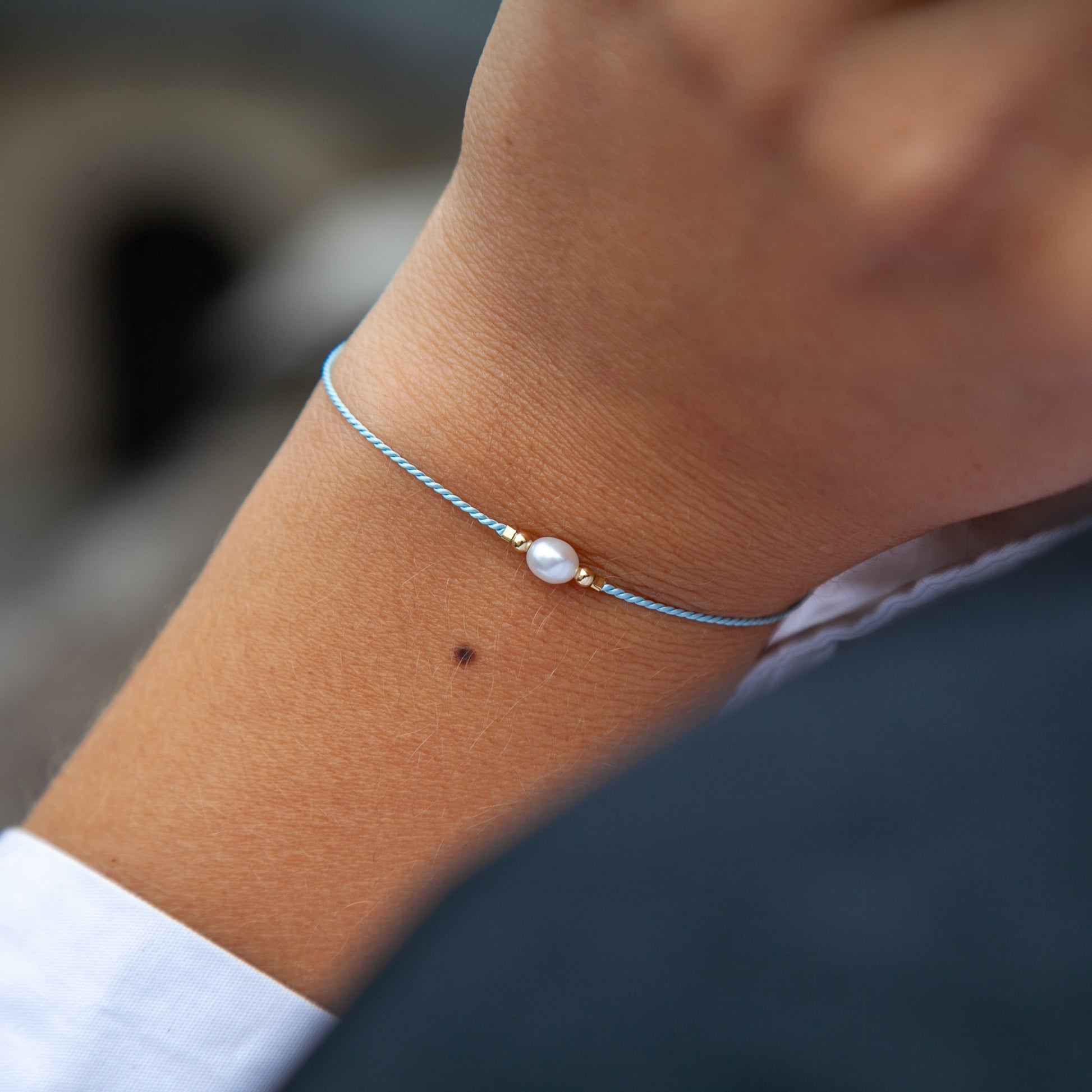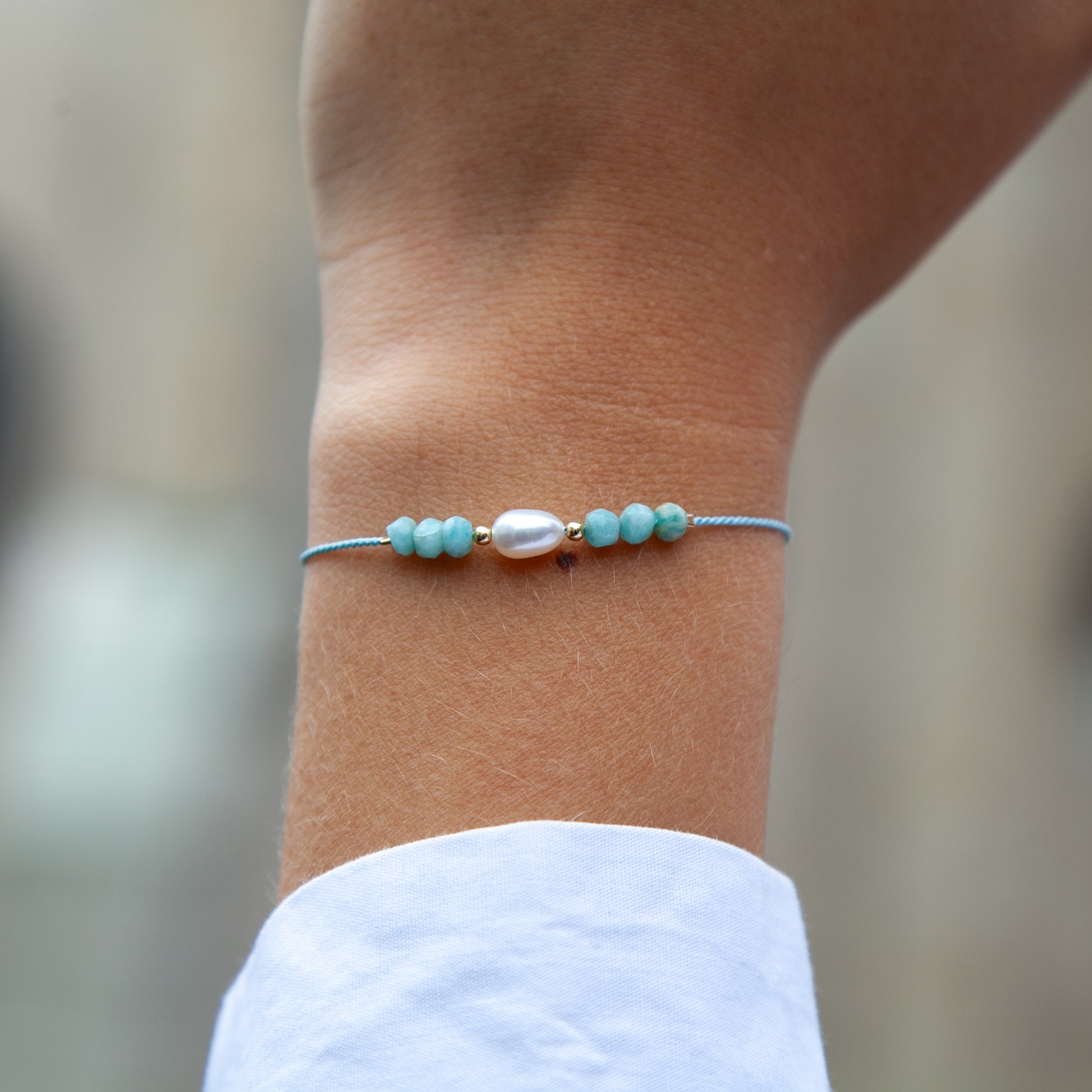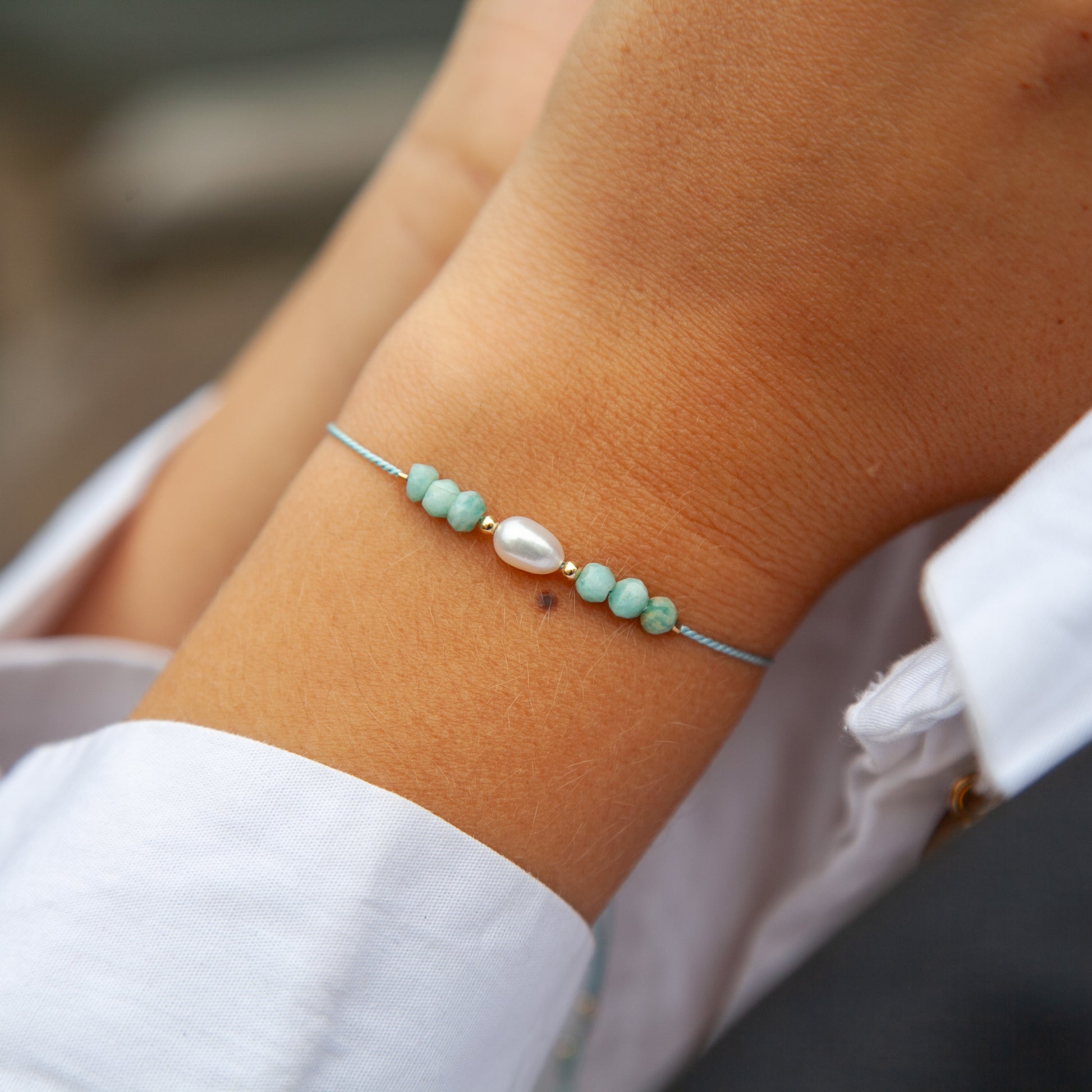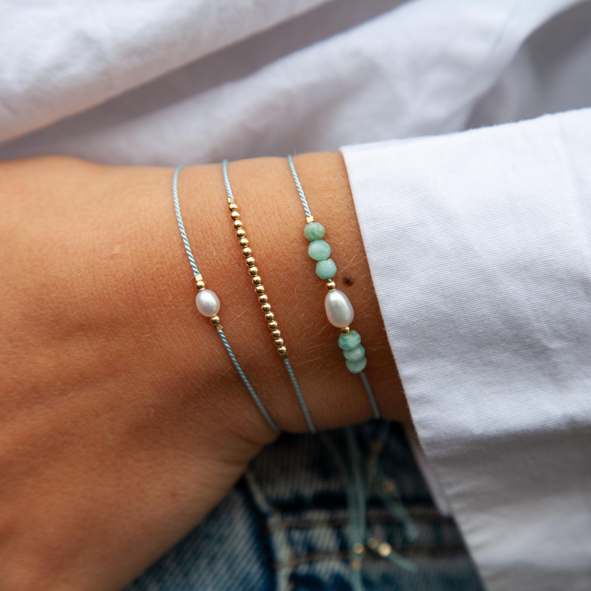 Minimalistické náramky z tyrkysové (světle modré) hevábné šňůrky, perel, broušených amazonitů a zlatých korálků. Krásné doplňky v něžném stylu.