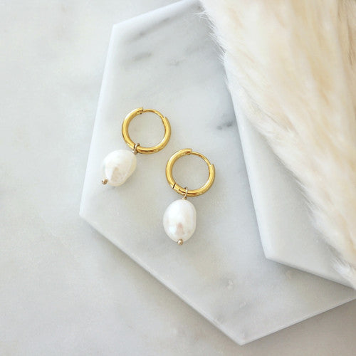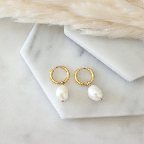 Pozlacené silnější kroužky z pozlacené nerez oceli s oválnými sladkovodnímu perlami.