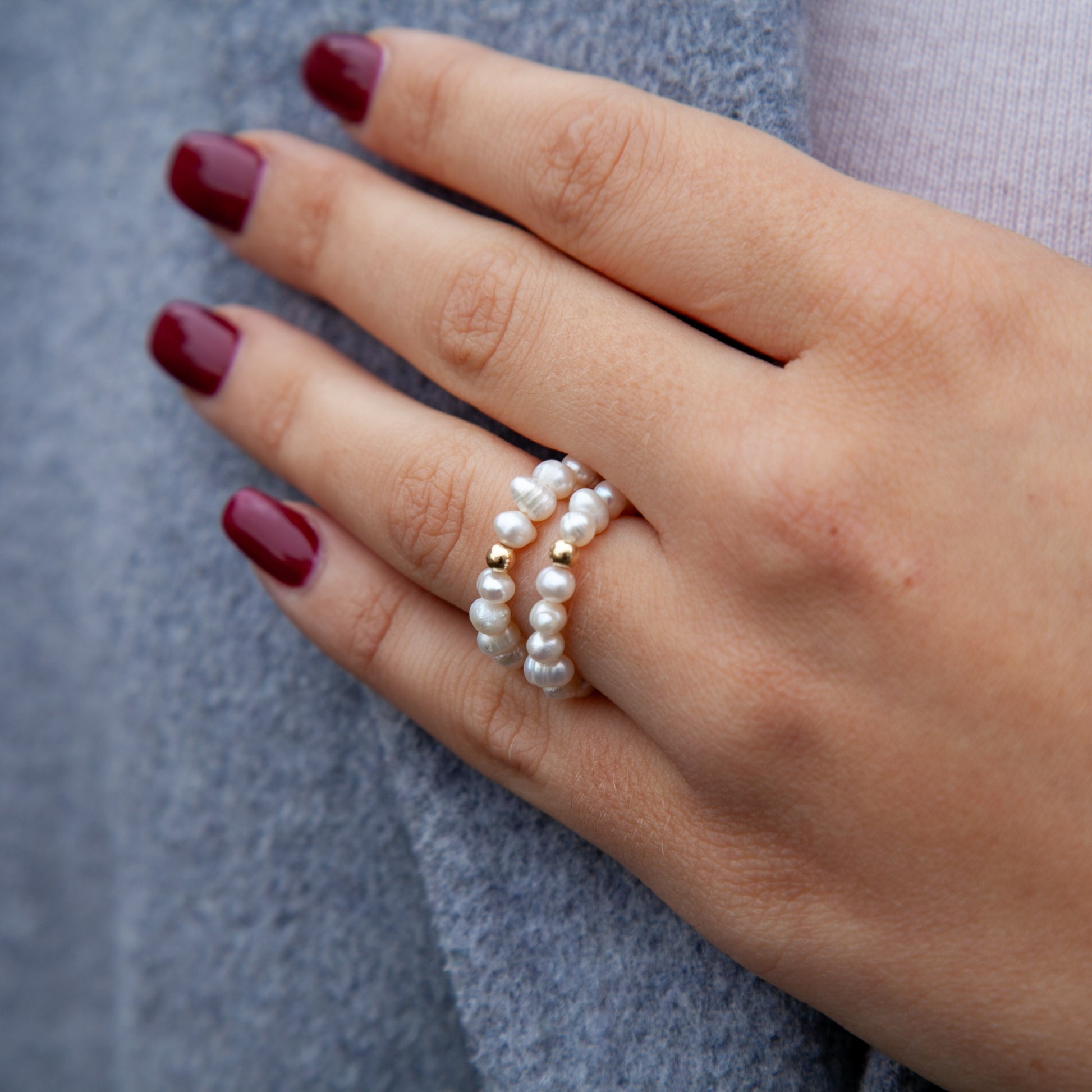 Něžný prstýnek z přírodních sladkovodních perel doplněných zlatým korálkem. Must have letní šperk!