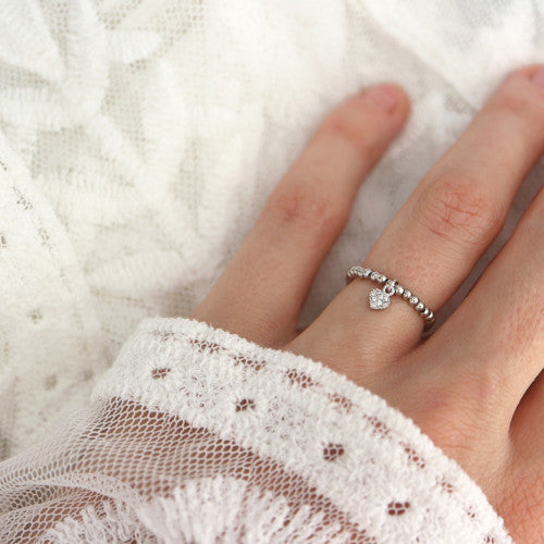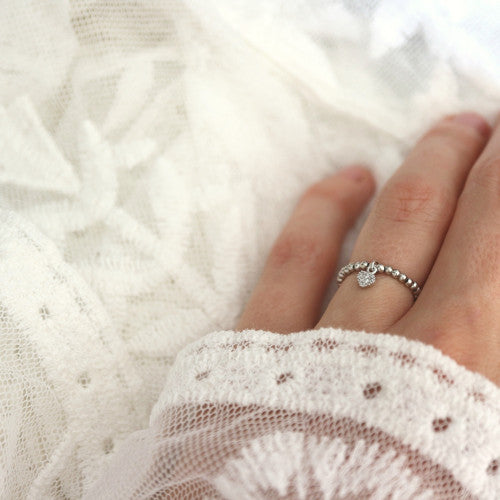 Něžný, minimalistický prstýnek z korálků se zirkonovým srdíčkem. Stříbrné provedení.