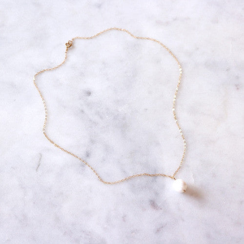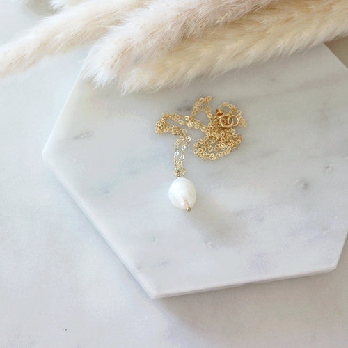 Oválná sladkovodní perla zavěšená na jemném řetízku.