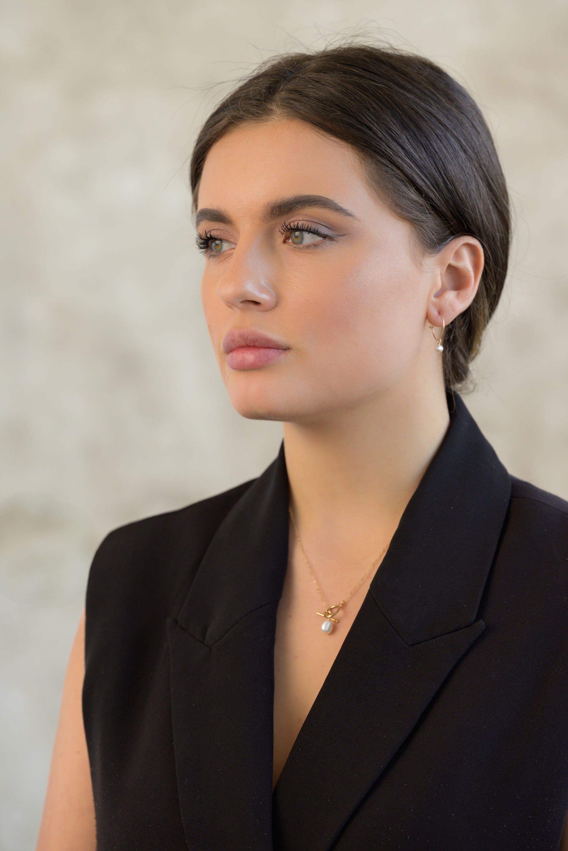 Jemný řetízek se zajímavým zapínáním umístěným vepředu na krku a sladkovodní perlou. Nejkvalitnější zlacení "gold filled" (plněno zlatem), díky němuž je řetízek vhodný i na každodenní nošení.