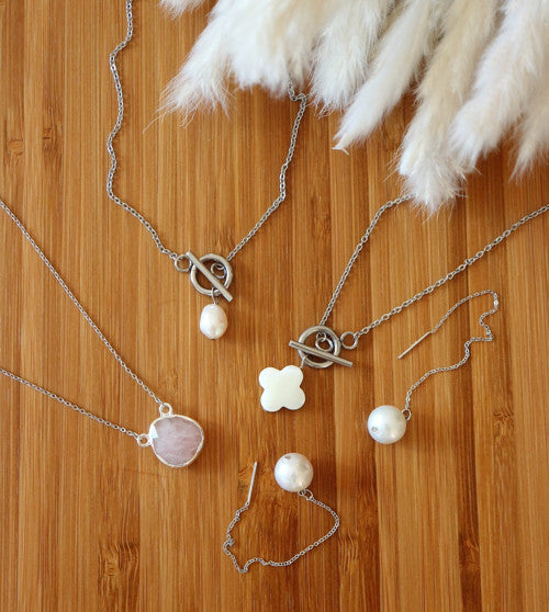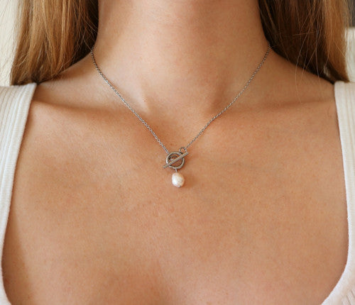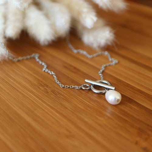 Řetízek se zajímavým zapínáním umístěným vepředu na krku a sladkovodní perlou ve stříbrném provedení. Jeden ze současných top trendů.