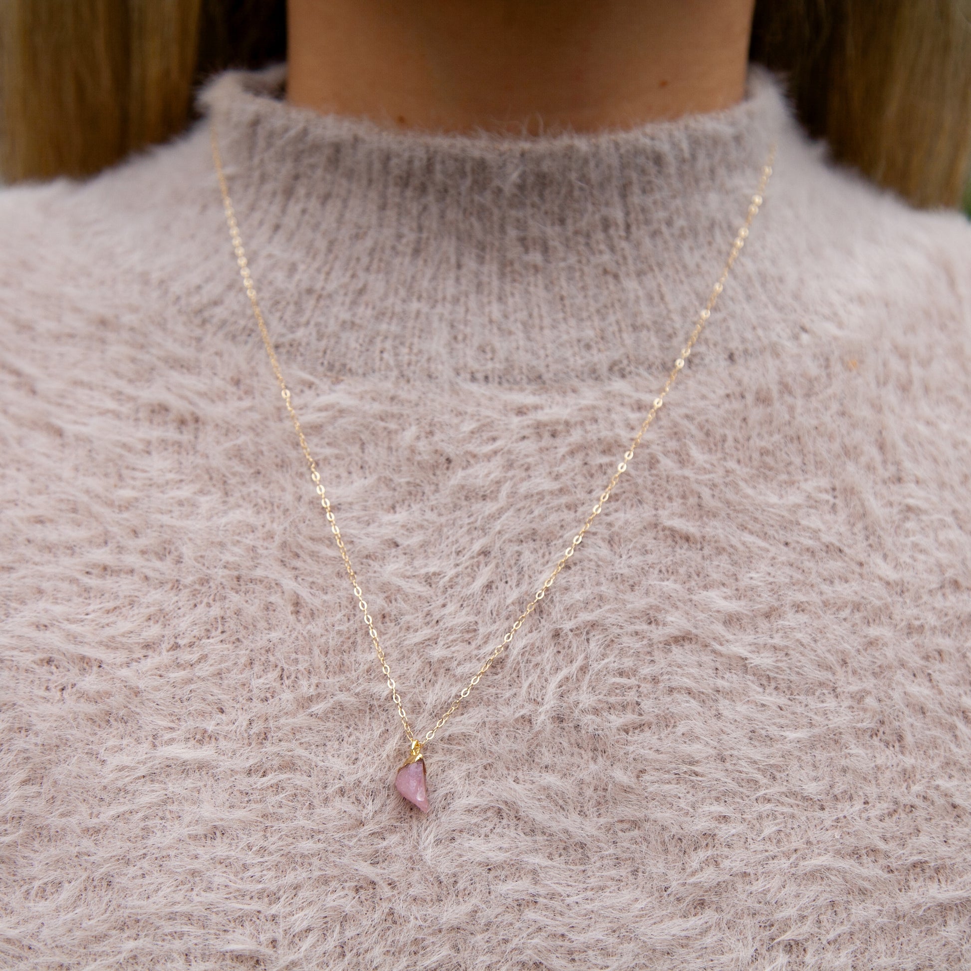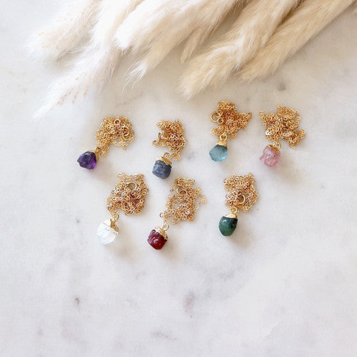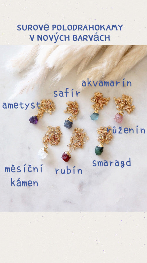 Jemné řetízky plněné zlatem (gold filled) s nádhernými surovými drahokamy. Můžete je nosit samostatně nebo kombinovat.