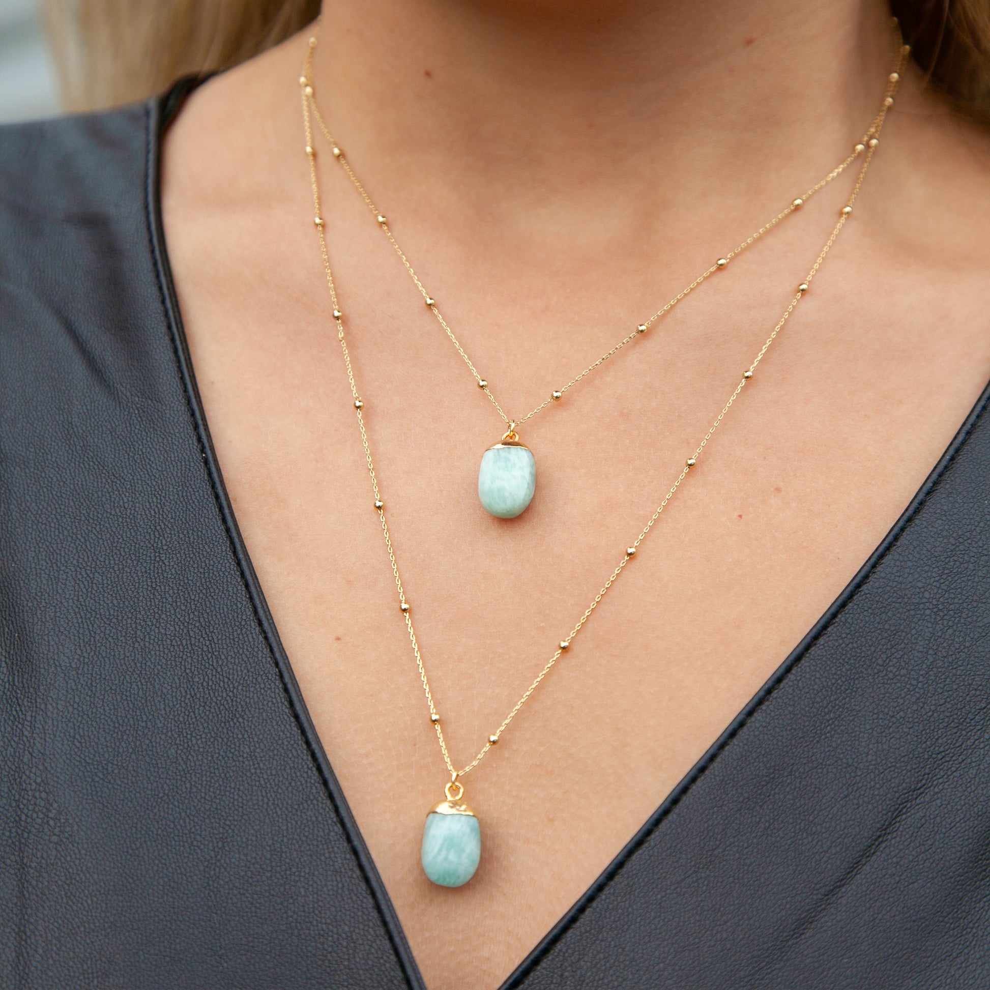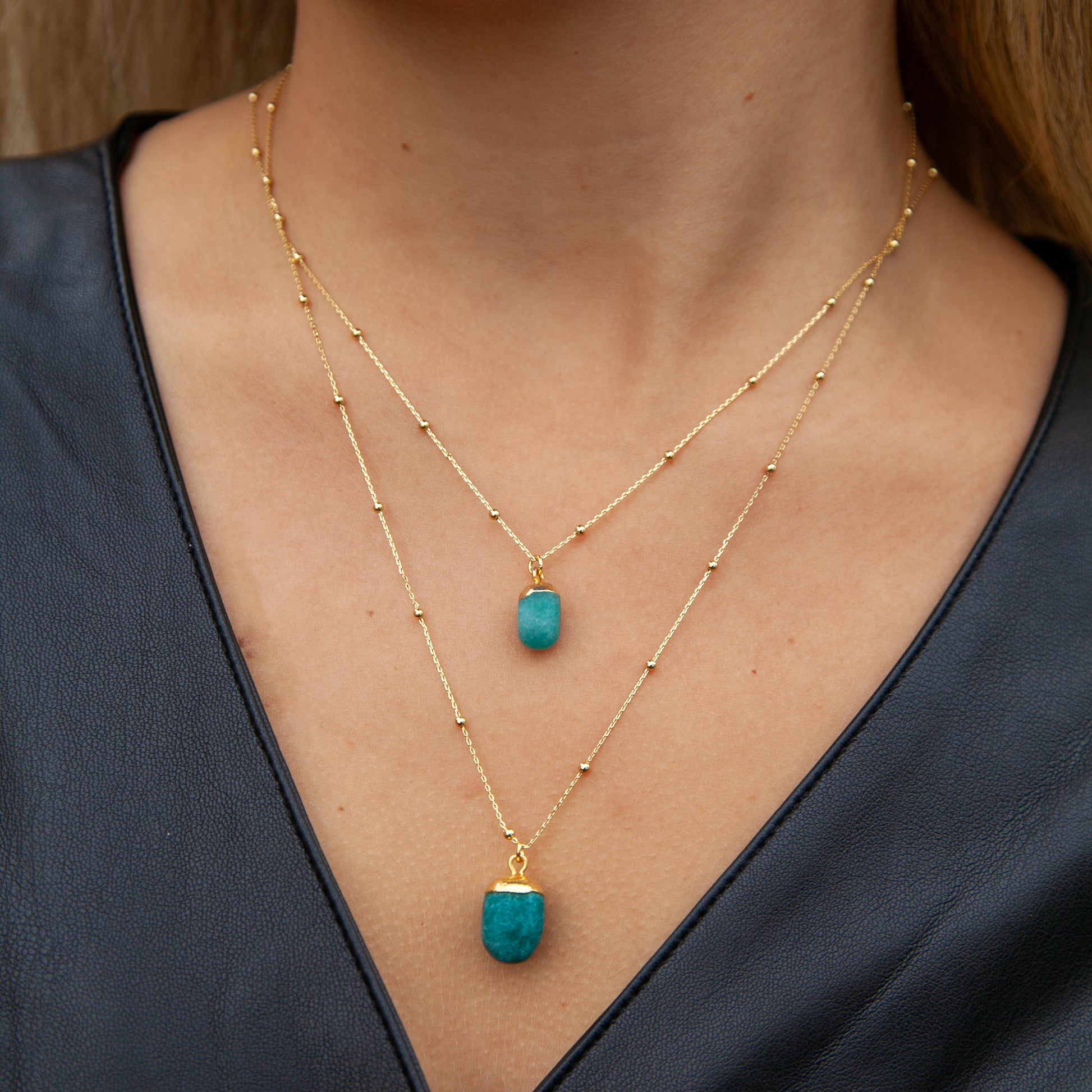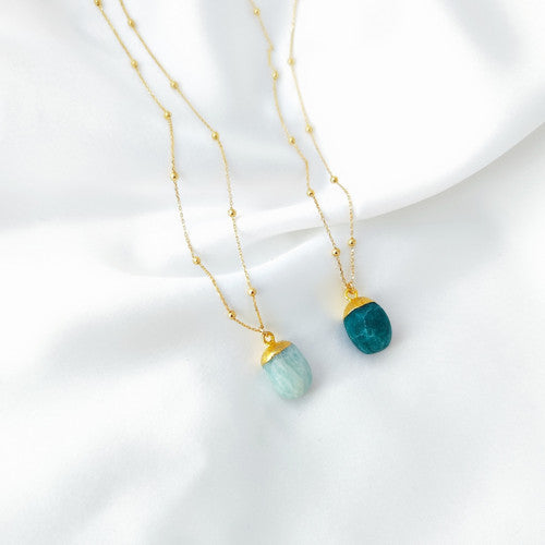 Pozlacené řetízky s kuličkami, na kterých jsou zavěšeny kameny laděné do zelených odstínů s matnou úpravou.