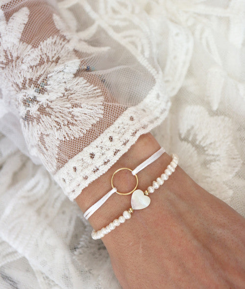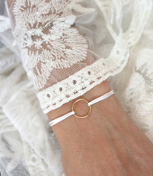 Náramek s pozlaceným kruhem (15 mm) a bílou saténovou šňůrkou. Kruh je potažen několika vrstvičkami 14 karátového zlata pro vysokou odolnost materiálu (gold filled), díky tomu můžete náramek nosit každý den bez obav ze změny barvy.