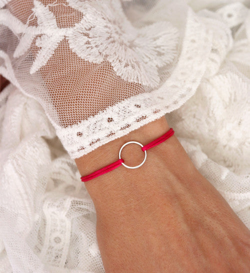 Náramek se stříbrným kruhem a fuchsiově růžovou saténovou šňůrkou. Satén je velmi příjemný na ruce.