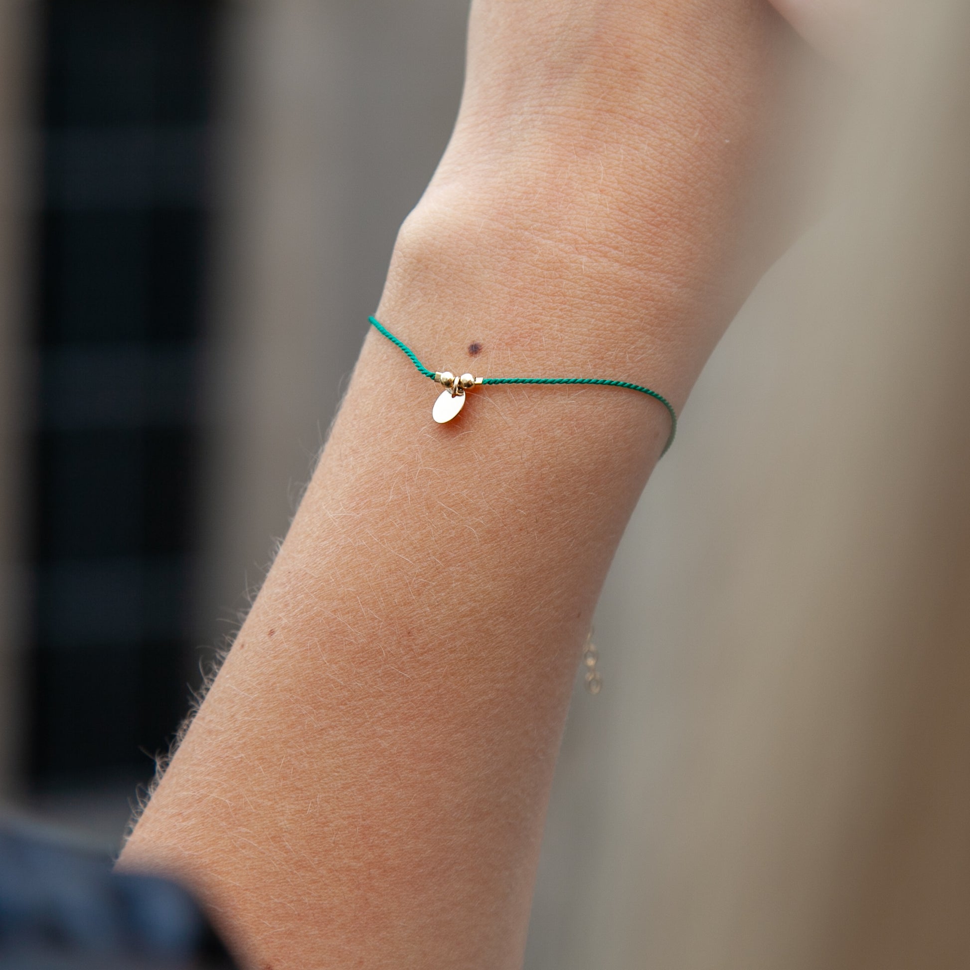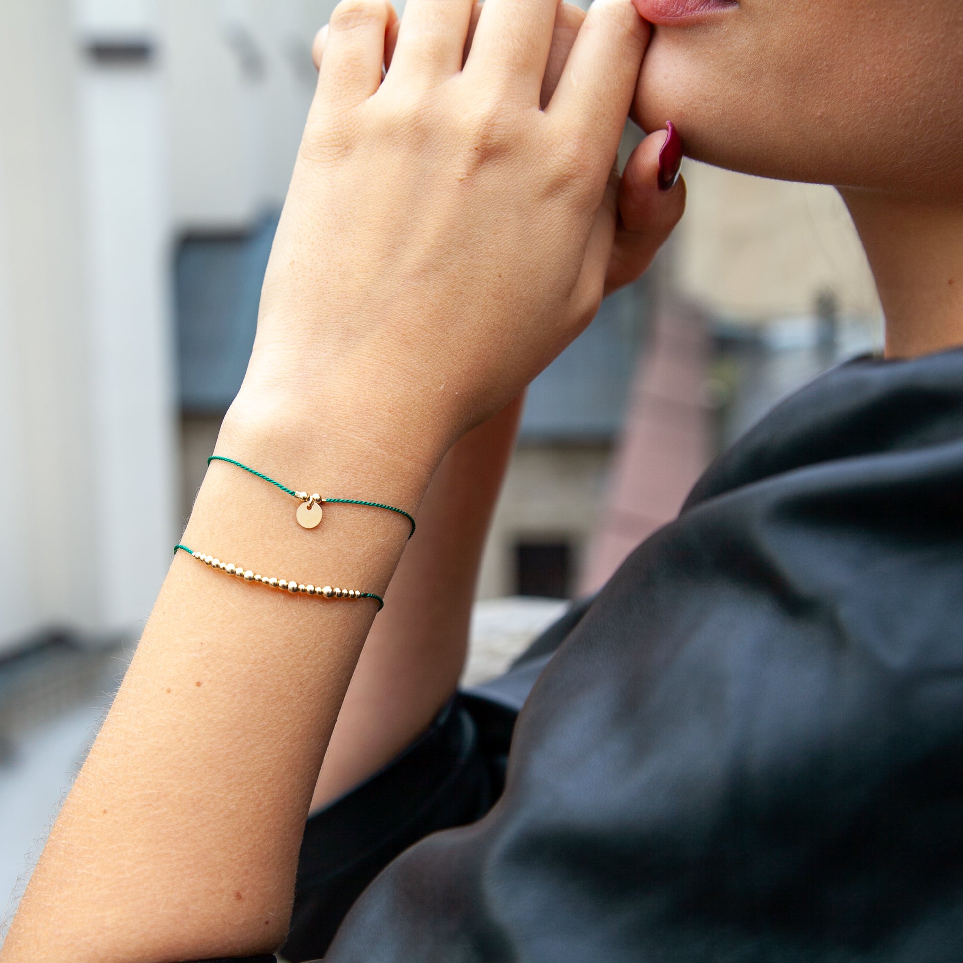 Dva minimalistické náramky ze smaragdově zelené hedvábné šňůrky s mincí a korálky.