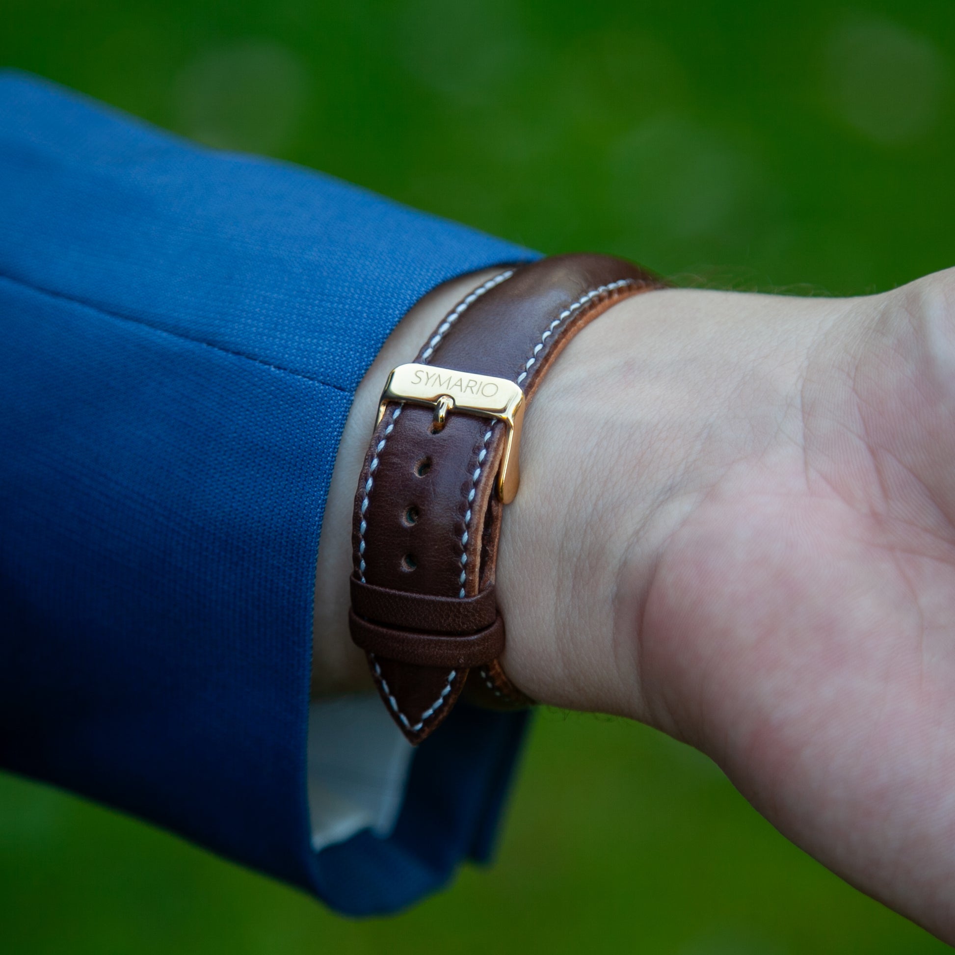 K výrobě hodinkových řemínků používáme nejkvalitnější třísločiněnnou kůži, která bude celý život pracovat a získávat bohatou patinu. Řemínek má v některých místech až čtyři vrstvy usně a je celý ručně obšitý sedlářským stehem.