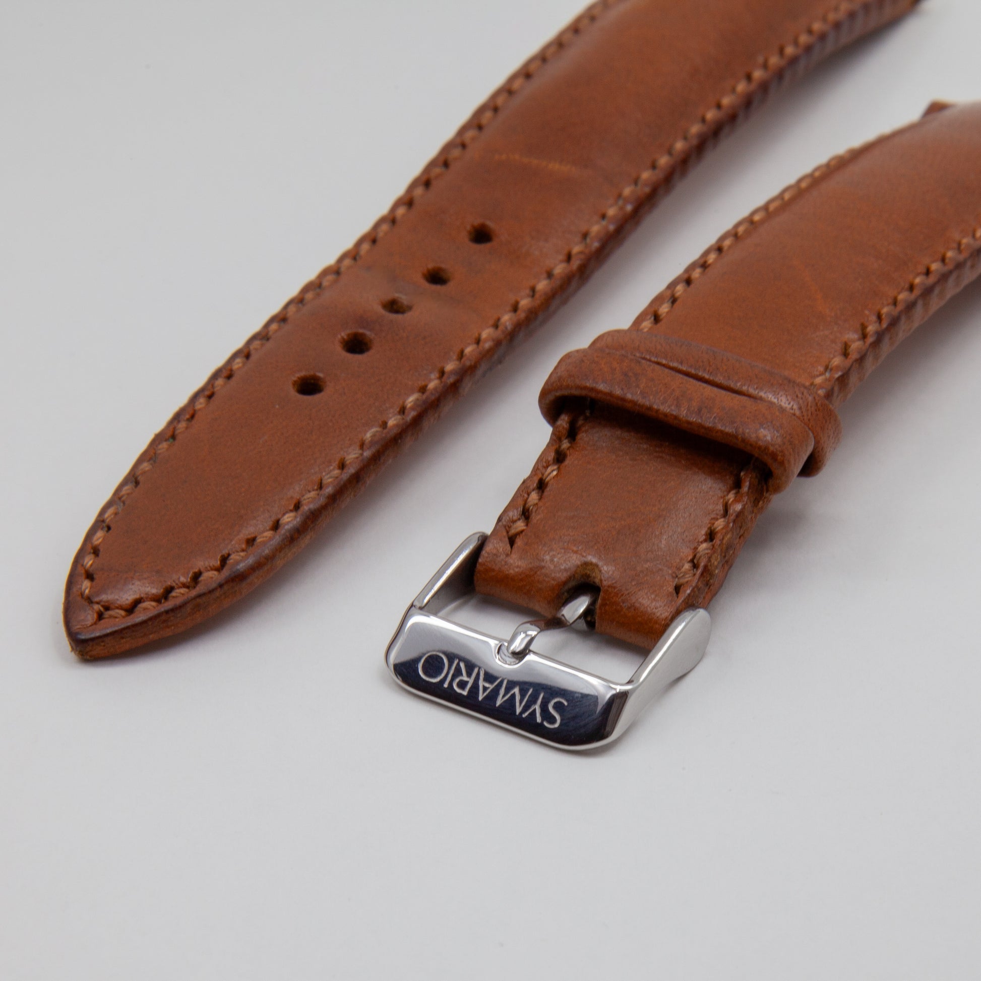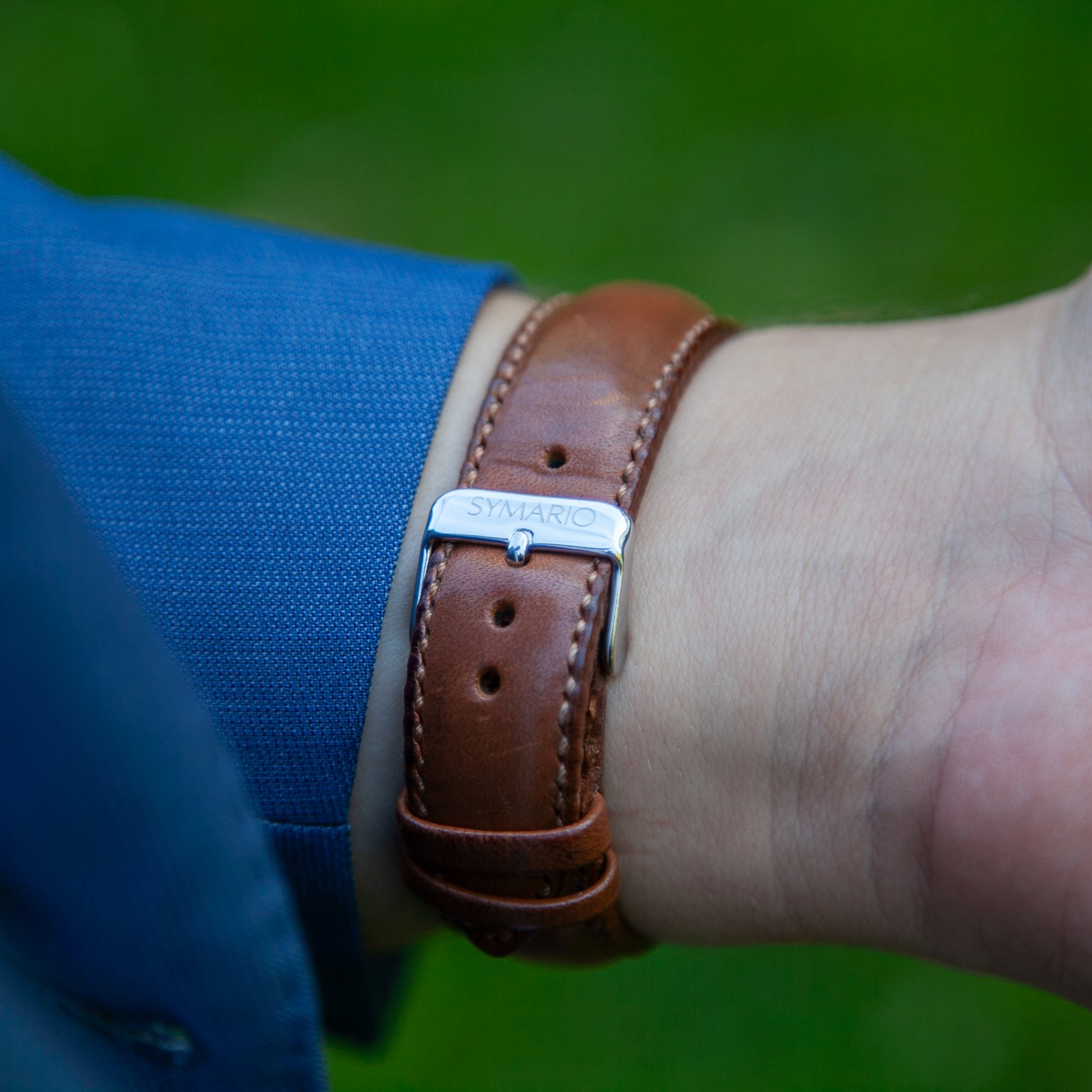 K výrobě hodinkových pásků se používá nejkvalitnější třísločiněnná kůže, která bude celý život pracovat a získávat bohatou patinu. Pásek má v některých místech až čtyři vrstvy usně a je celý ručně obšitý sedlářským stehem.